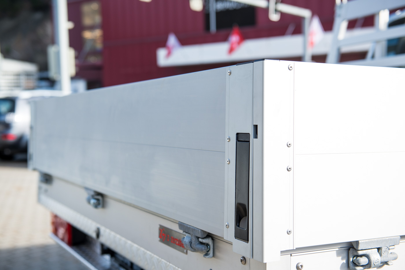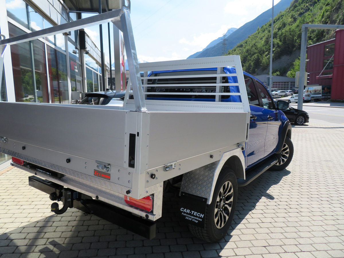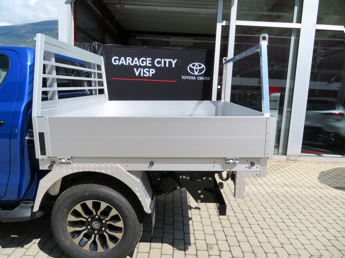 Die Standard Pritsche wurde mit einer von uns massangefertigen Aluminiumaufbau ersetzt. So sind die drei Seiten der Ladefläche abklappbar - einfacheres und schnelleres Be-und Entladen!